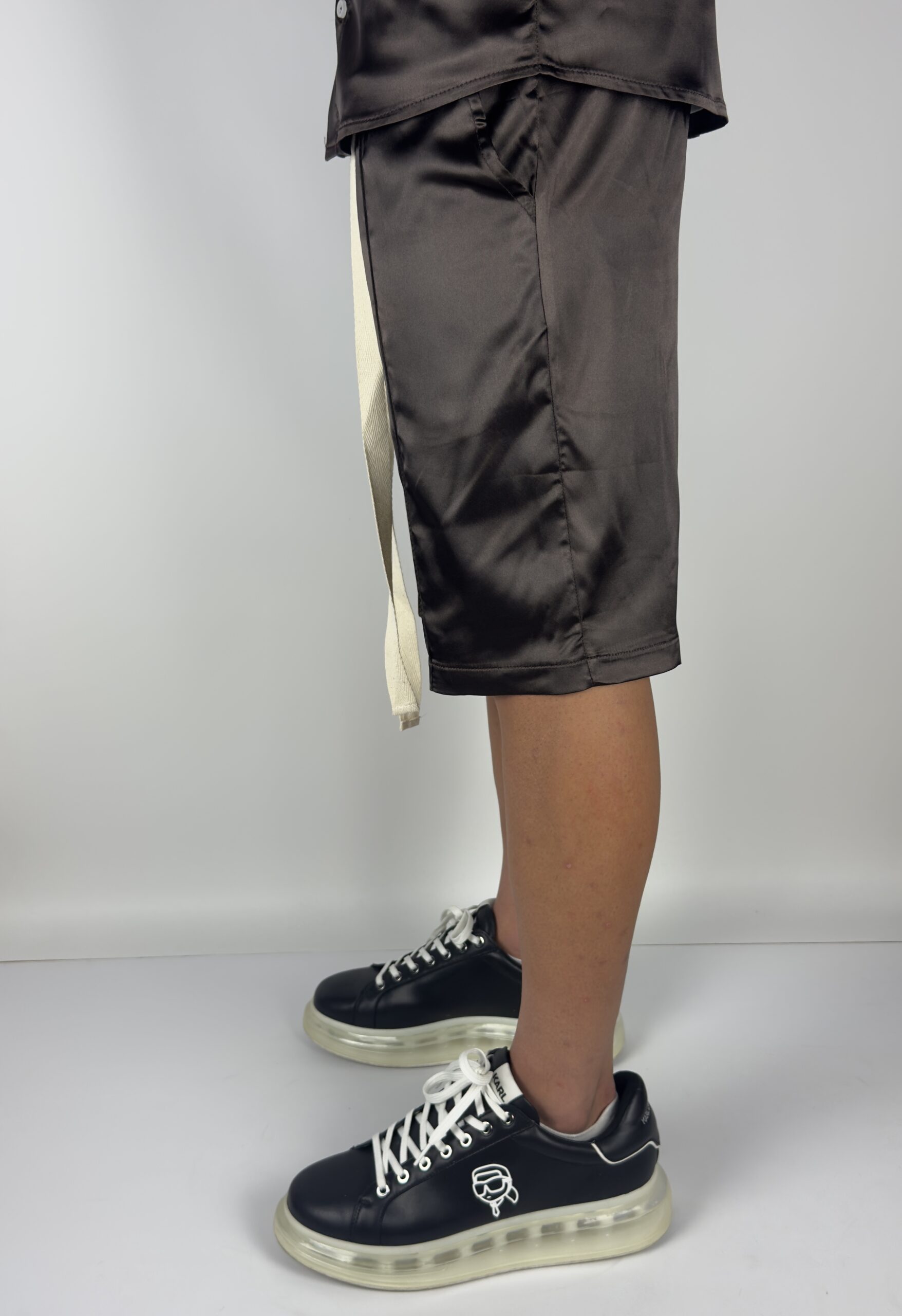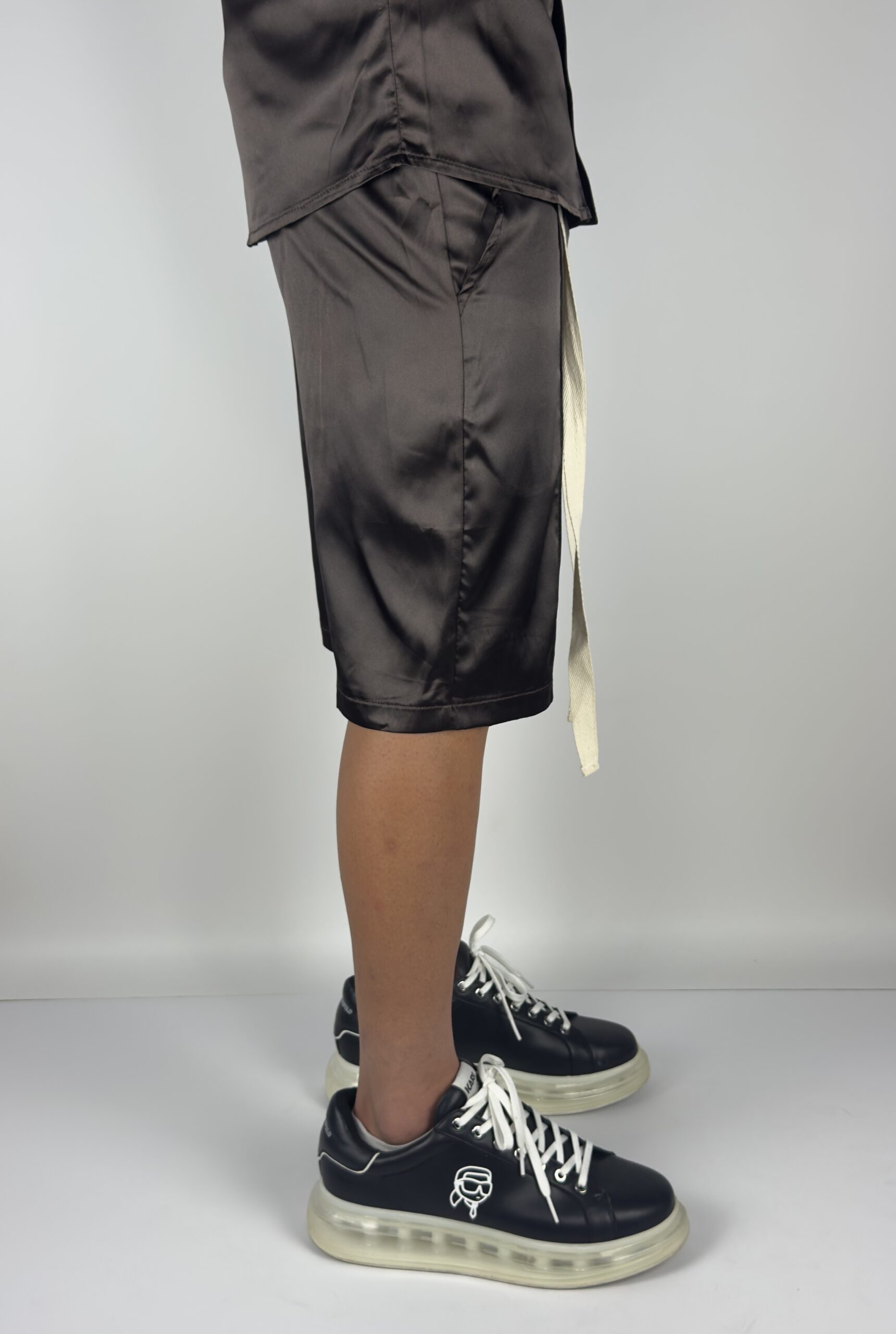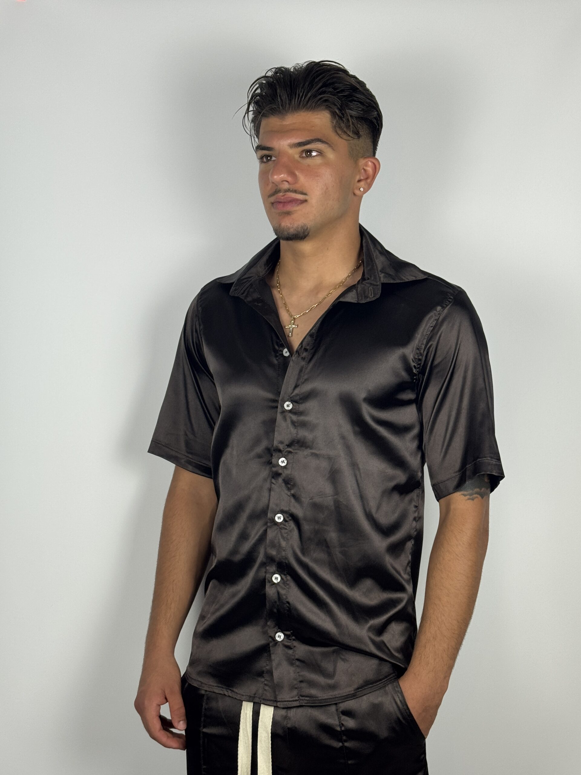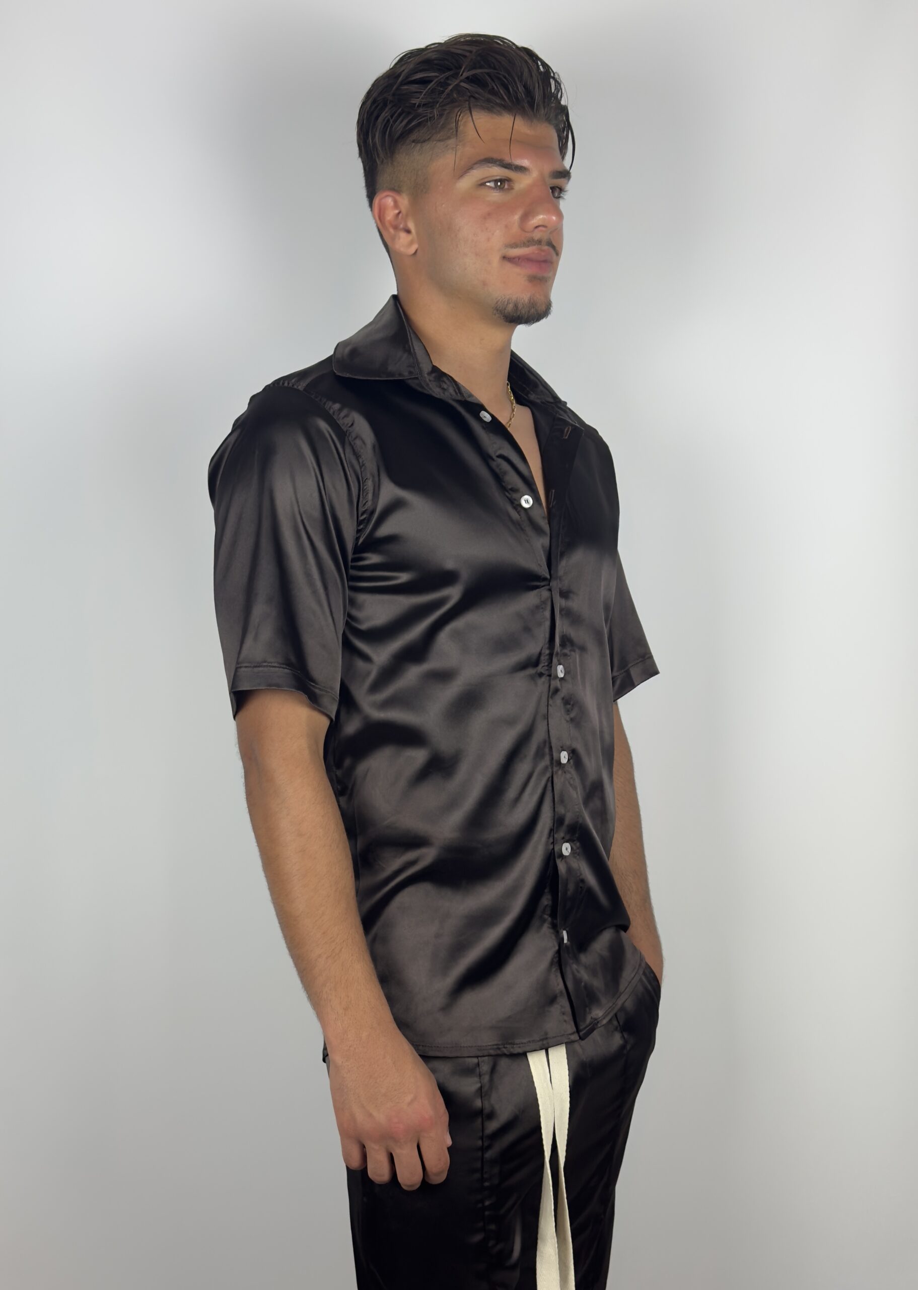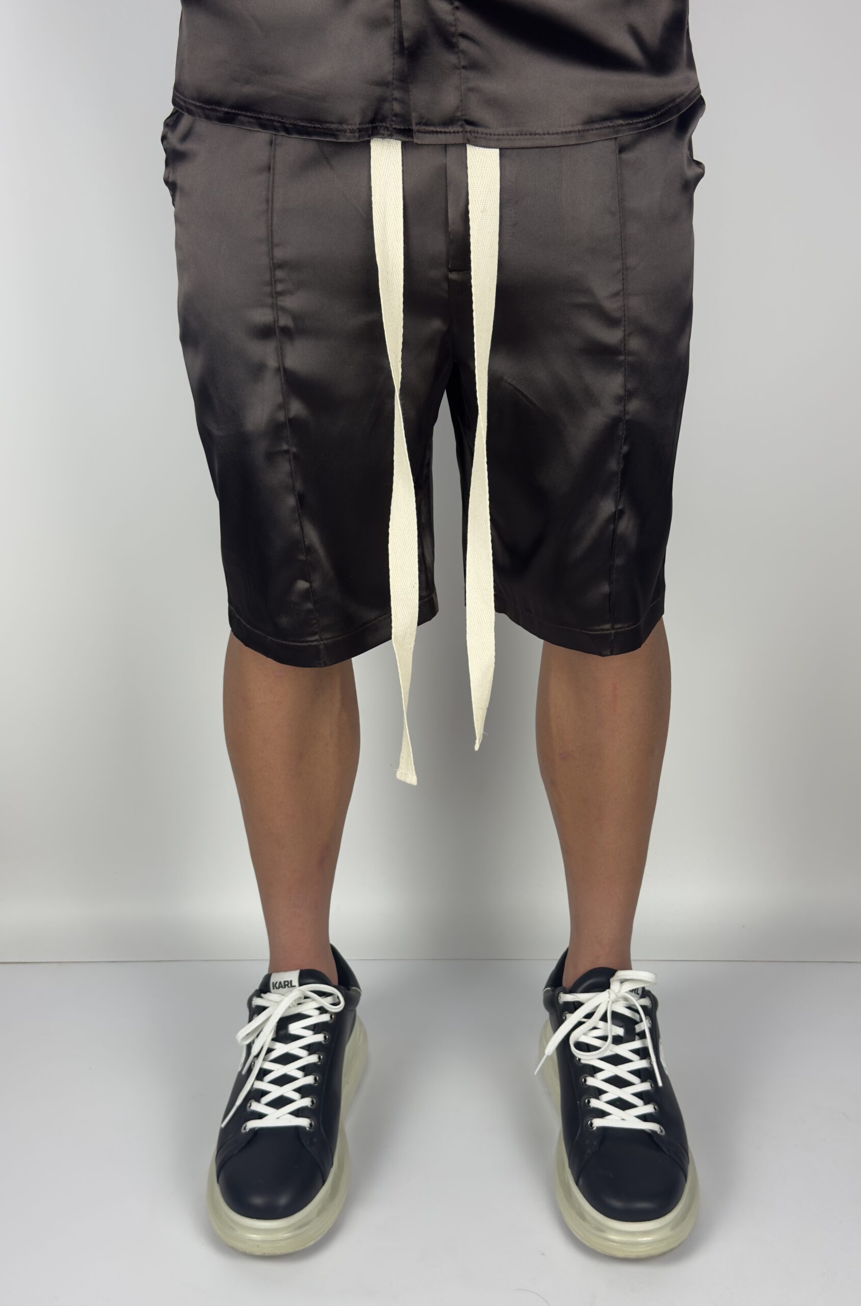 Eleganță cu atitudine. Acest compleu din satin negru redefinește stilul casual prin texturi sofisticate și detalii îndrăznețe. Cămașa cu mânecă scurtă are un luciu subtil și o croială care urmărește lejer linia corpului, iar pantalonii scurți păstrează nota urbană prin cusăturile verticale și șnurul alb contrastant.